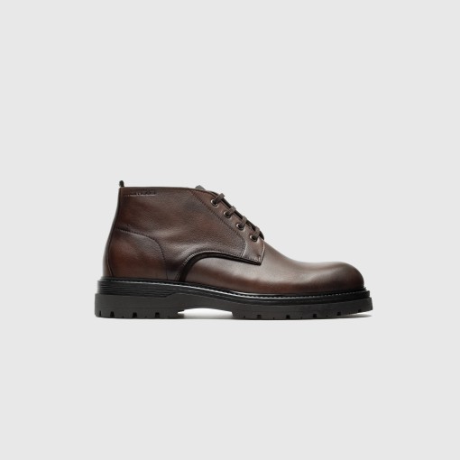 Um botim de inspiração clássica com uma sola oversized para uma estética moderna. Gáspea 100% em pele com pormenor de vivo na lateral, e fita em tecido no cano.