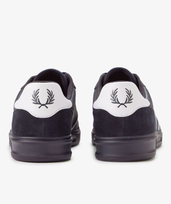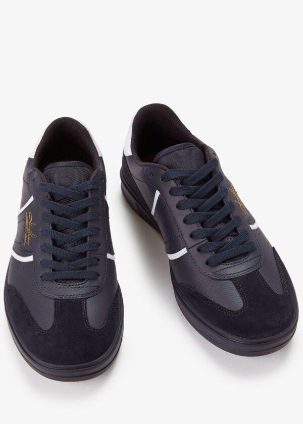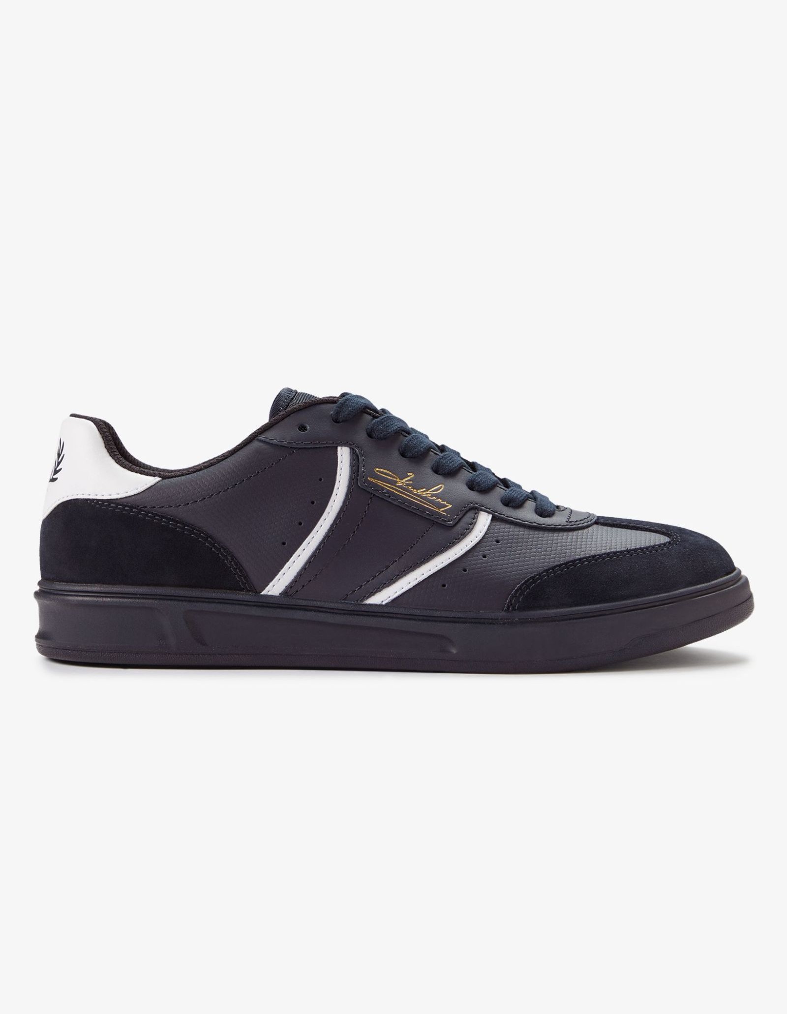 Parte lateral e sobreposição em pele de flor integral suave / Calcanhar em camurça / Atacadores em poliéster reciclado / Forro e meia interior em malha e poliéster reciclado / Símbolo da marca em folha dourada no painel lateral e na aplicação da pala
